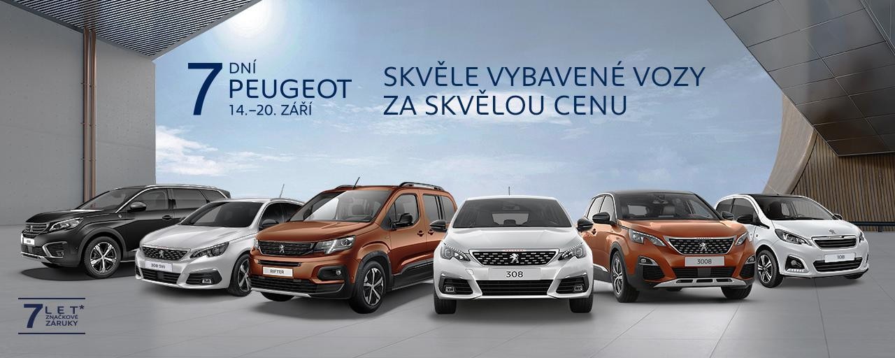 Akce 7 dní Peugeot se v Česku již stala tradicí, a proto mnozí příznivci značky vědí, že v září nastává ten pravý čas pro nákup osobního vozu Peugeot za zvýhodněnou cenu. Celá koncesionářská síť Peugeot očekává, že od 14. do 20. září bude v showroomech rušno. Letošní akční nabídka je navíc mimořádně atraktivní. Poprvé v historii se totiž prodlužuje značková záruka u většiny modelů osobní řady na 7 let (100 000 km). Kromě toho jsou tyto vybrané modely nabízeny za zvýhodněné ceny.