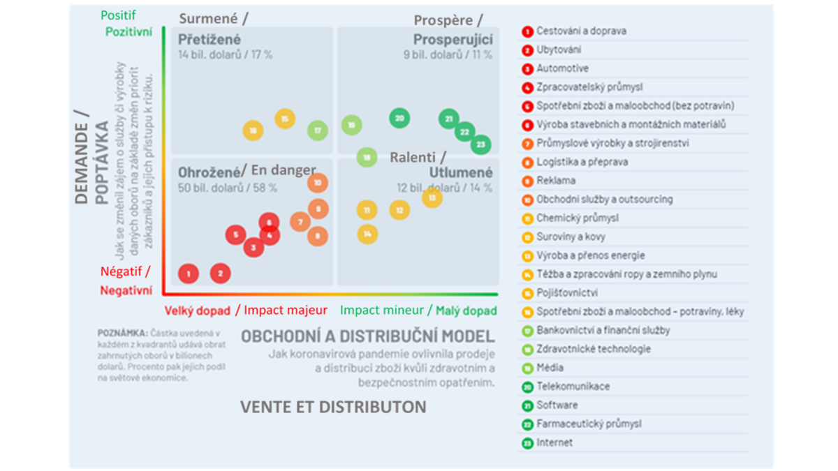 Firma Simon-Kucher & Partners se věnuje zejména marketingovým strategiím. V červenci zveřejnila vyhodnocení, které zkoumá dopady pandemie koronaviru na obory globální ekonomiky. Autoři čtyřdimenzionální analýzy určili čtyři kvadranty, do kterých podniky zařadili a které definují jejich pozici v "postkoronasvětě": prosperující, přetížené, utlumené a ohrožené.