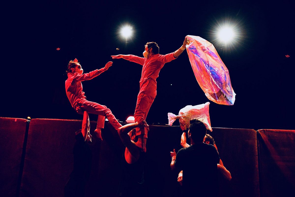 Soubor Akoreacro, který není v Praze poprvé, se představil ve složení jediná žena a desítka mužů. Právě kolem oné ženy se točí velká část příběhu, ale také akrobatických prvků. Žena létá vzduchem, stoupá k výšinám po pažích i hlavách mužů. Velmi originální součástí představení je i několik elektrospotřebičů a tak například v jednu chvíli chodí po šapitó pračka, ze které koukají nohy v červených kalhotách, lednice se zase stane odrazovým můstkem pro lety těsně pod špičku stanu. Rytmus představení dodává živá hudba, saxofonista, klávesák i bubeník také šplhají do několikametrové výšky a stávají se plnohodnotnou součástí akrobatického souboru.