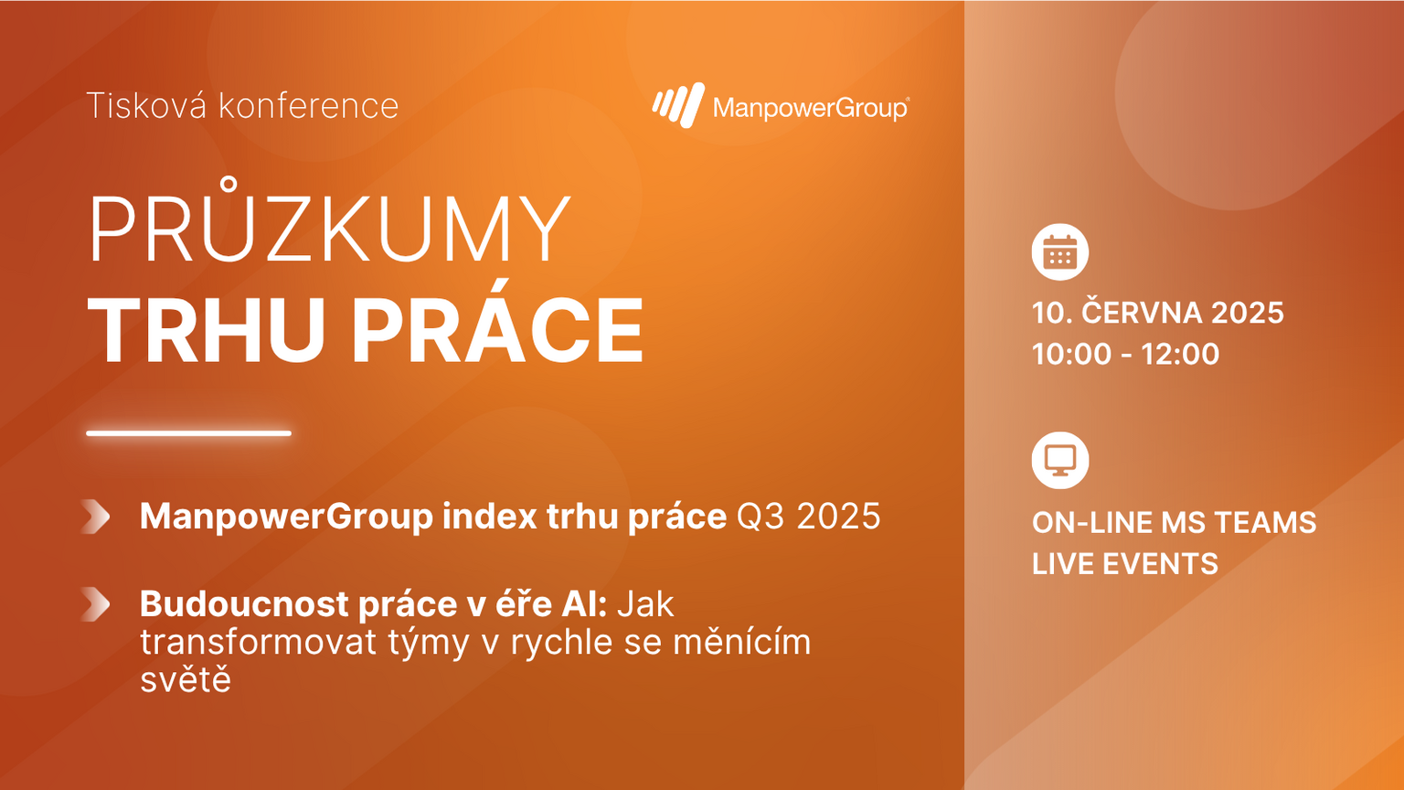 - ManpowerGroup index trhu práce Q3 2025: Barometr nálad na trhu práce, který monitoruje náborové plány zaměstnavatelů tentokrát pro 3. čtvrtletí 2025. Jak se bude vyvíjet poptávka po zaměstnancích v jednotlivých oborech, regionech a velikostech společností.