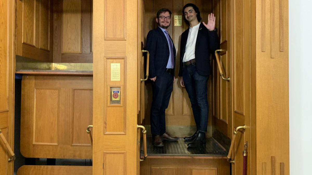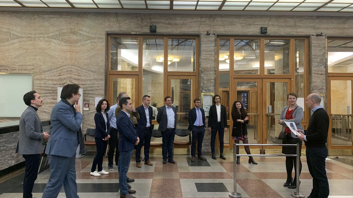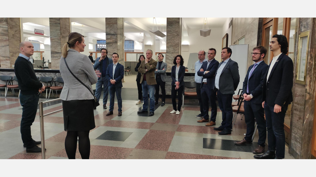 Po několika slovech na úvod následovala exkluzivní a podrobná prohlídka. Hosté se mohli seznámit s úžasnou prací architektky Eva Jiricna. Klasický páternoster, který dodnes denně slouží zaměstnancům, nás vyvezl na střechu, odkud je úchvatný výhled na kopuli Národního muzea a skleněnou střechu banky.