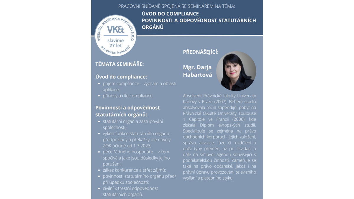 Přednášející:Mgr. Darja Habartová (Vyskočil, Krošlák a partneři, s.r.o., advokátní kancelář)