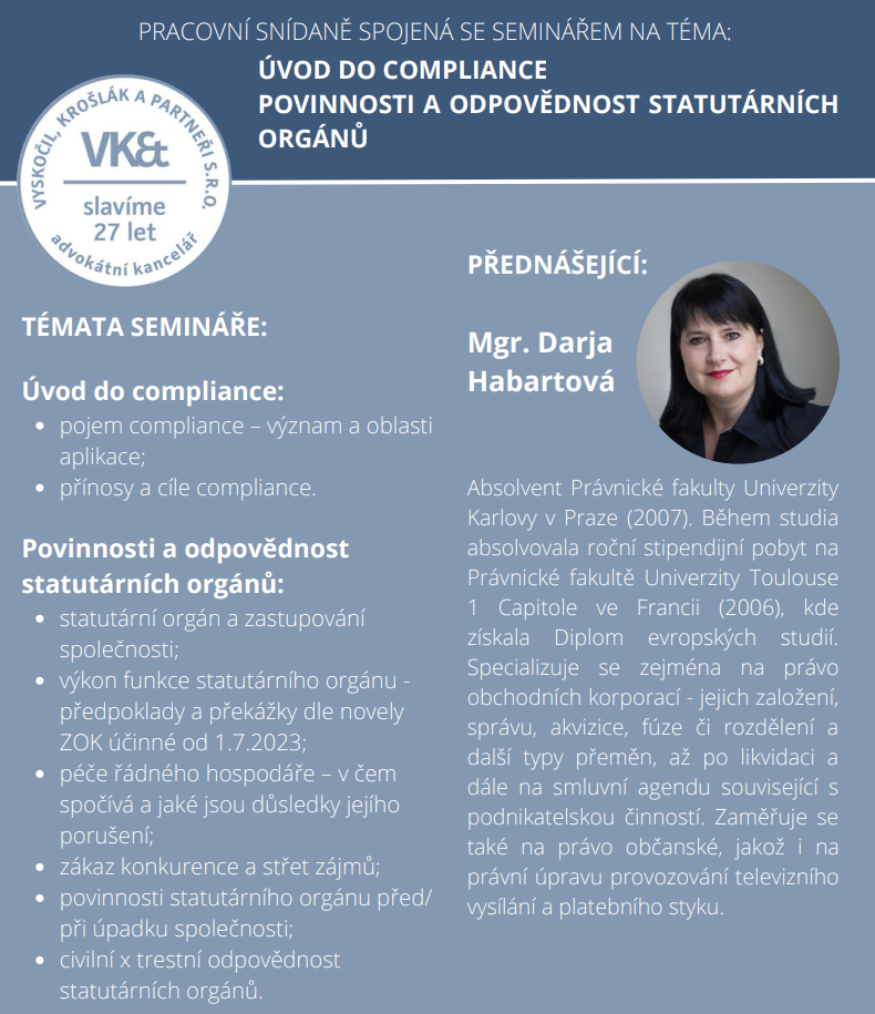 Pracovní snídaně spojená se seminářem na téma: Úvod do compliance, povinnosti a odpovědnost statutárních orgánů