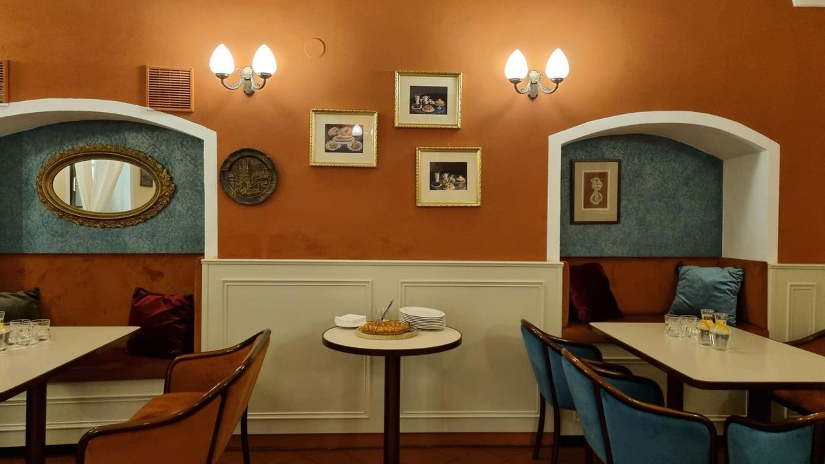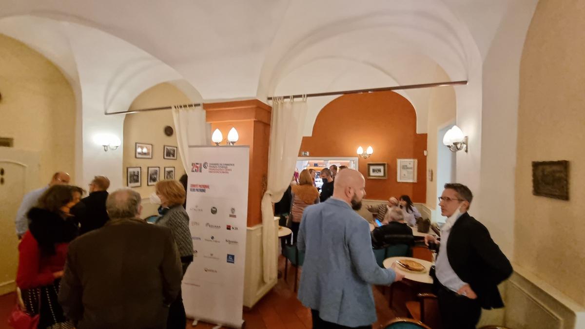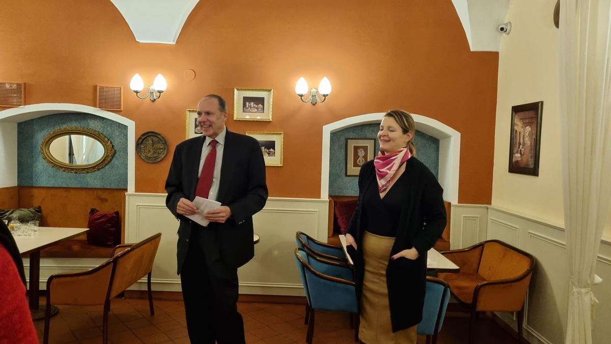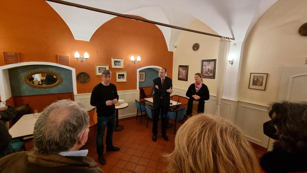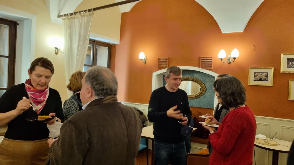 V úzkém kruhu účastníci ochutnali, a někteří teprve poprvé, frangipánový dort (frangipán je mandlová náplň) připravený naším hostitelem, cukrárnou, kterou znají všichni pražští labužníci.