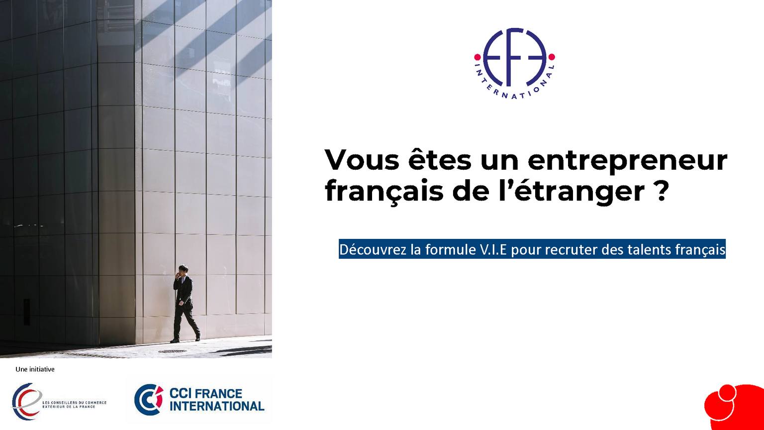 Les Conseillers du Commerce extérieur de la France et CCI France International ont allié leurs forces en créant EFE International : une nouvelle structure au service des entrepreneurs français de l’étranger (EFE), notamment pour assurer le portage de V.I.E (Volontaires Internationaux en Entreprises).