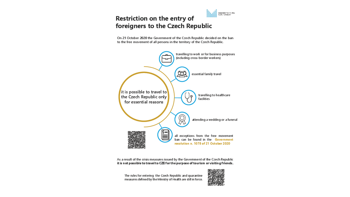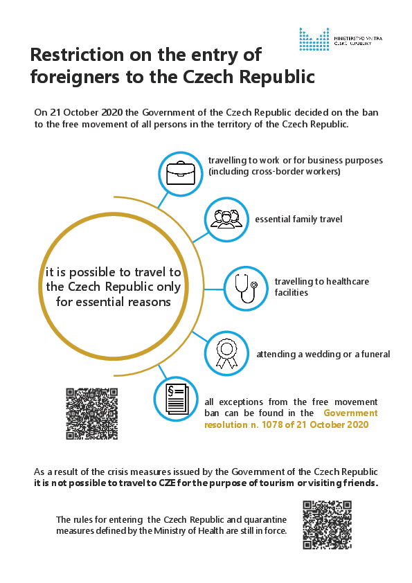 Suite à l'évolution de la pandémie de COVID-19, le gouvernement tchèque a décidé le 21 octobre de restreindre l'accès au territoire national. Il est seulement possible de rentrer sur le territoire tchèque pour les raisons suivantes :