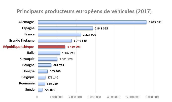 Les constructeurs automobiles présents en République tchèque – Skoda Auto, TPCA, Hyundai, Iveco, SOR, Avia, Tatra – ont produit 1 411 330 de véhicules (dont 99,5% d’automobiles) en 2017, ce qui correspond à 6,4% de la production européenne, à 1,4% de la production mondiale et à la production cumulée de la Pologne, de la Hongrie et de la Roumanie la même année.