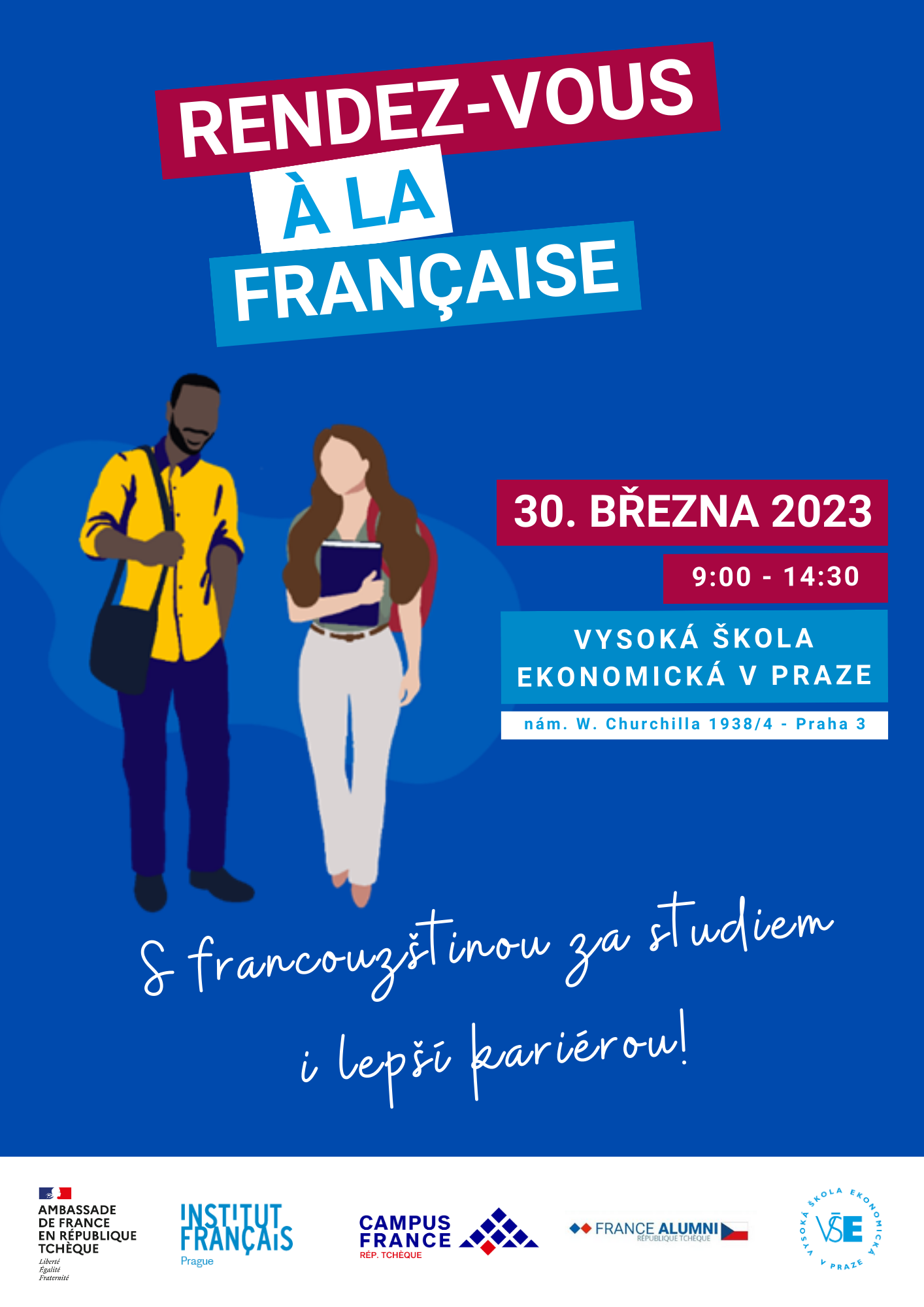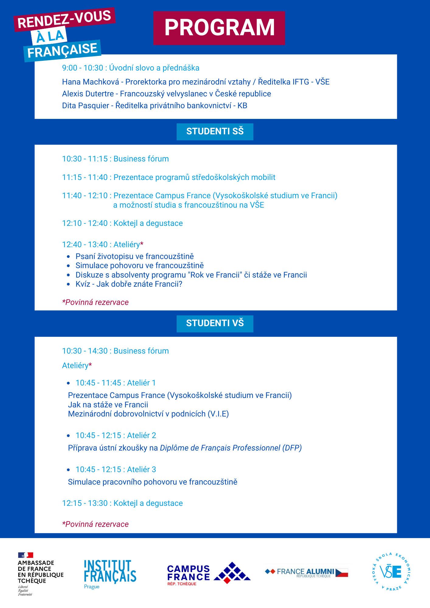 Dans le cadre de la „Semaine de l’innovation“ de la VŠE, l´Université d´Economie de Prague organise en coopération avec l´Ambassade de France, l’Institut français de Prague et la CCFT „Rendez-vous à la française“, un événement de promotion de la France et de la langue française, permettant aux étudiants de rencontrer des entreprises françaises et des entreprises recrutant des francophones, implantées en R.T. VŠE vous propose la location d’un stand dans l’Atrium de la Rajská budova qui vous permettra de présenter votre entreprise ainsi que vos opportunités de stage ou d’emploi non seulement aux étudiants de la VŠE, mais aussi à des lycéens pragois francophones. L´événement sera inauguré par une conférence « La France – pays de l’innovation » de M. Alexis Dutertre, Ambassadeur de France, qui aura lieu de 9h00 à 10h30. Les stands seront ouverts de 10h30 à 14h00. Parallèlement, des workshops pour les étudiants francophones auront lieu dans les salles qui donnent accès à l´Atrium et à partir de 12h00 un buffet sera offert aux étudiants au milieu des stands. L´objectif de la « Semaine de l’innovation », semaine banalisée au sein de l’université et où les cours sont supprimés, est de proposer aux étudiants des activités innovantes, en lien avec le monde socio-économique. C’est donc une opportunité unique de faire se rencontrer étudiants motivés et entreprises françaises ou intéressées par des profils francophones, en exclusivité et présenter la France comme une puissance économique.