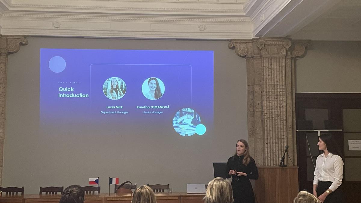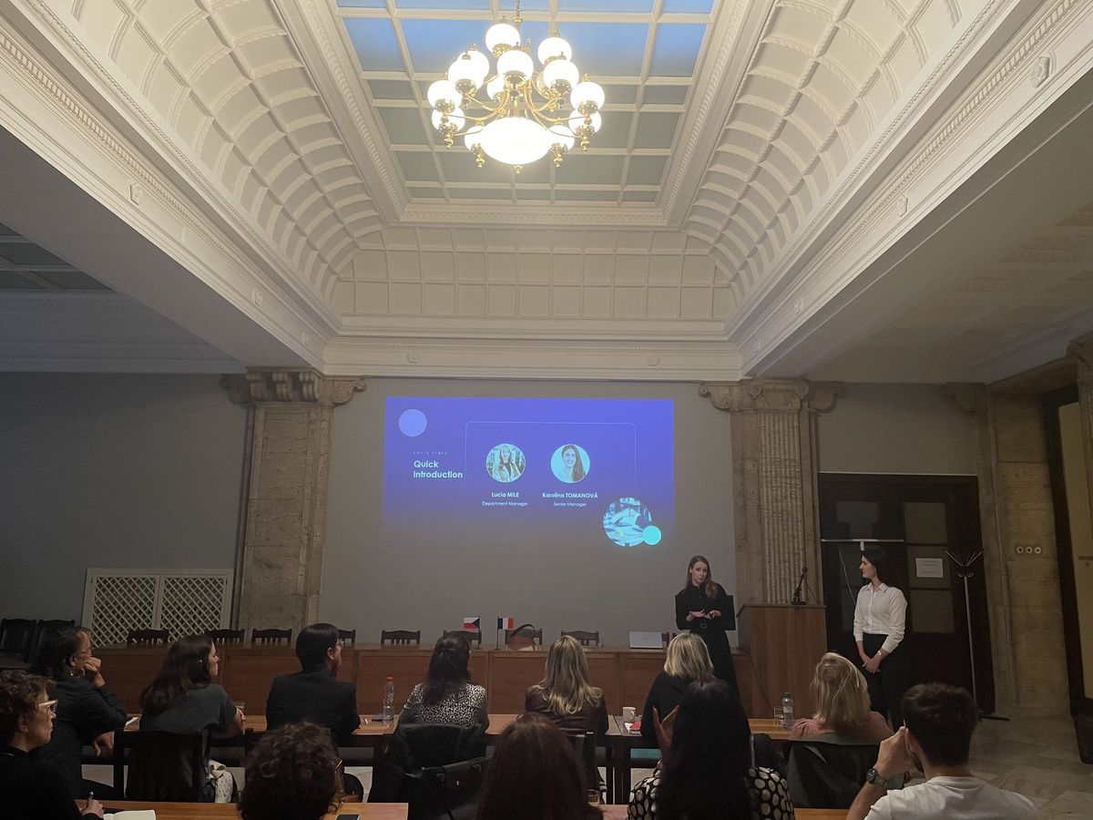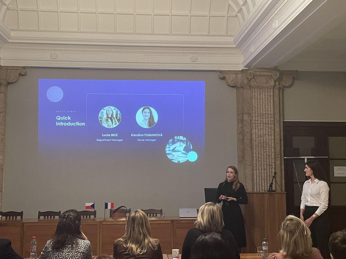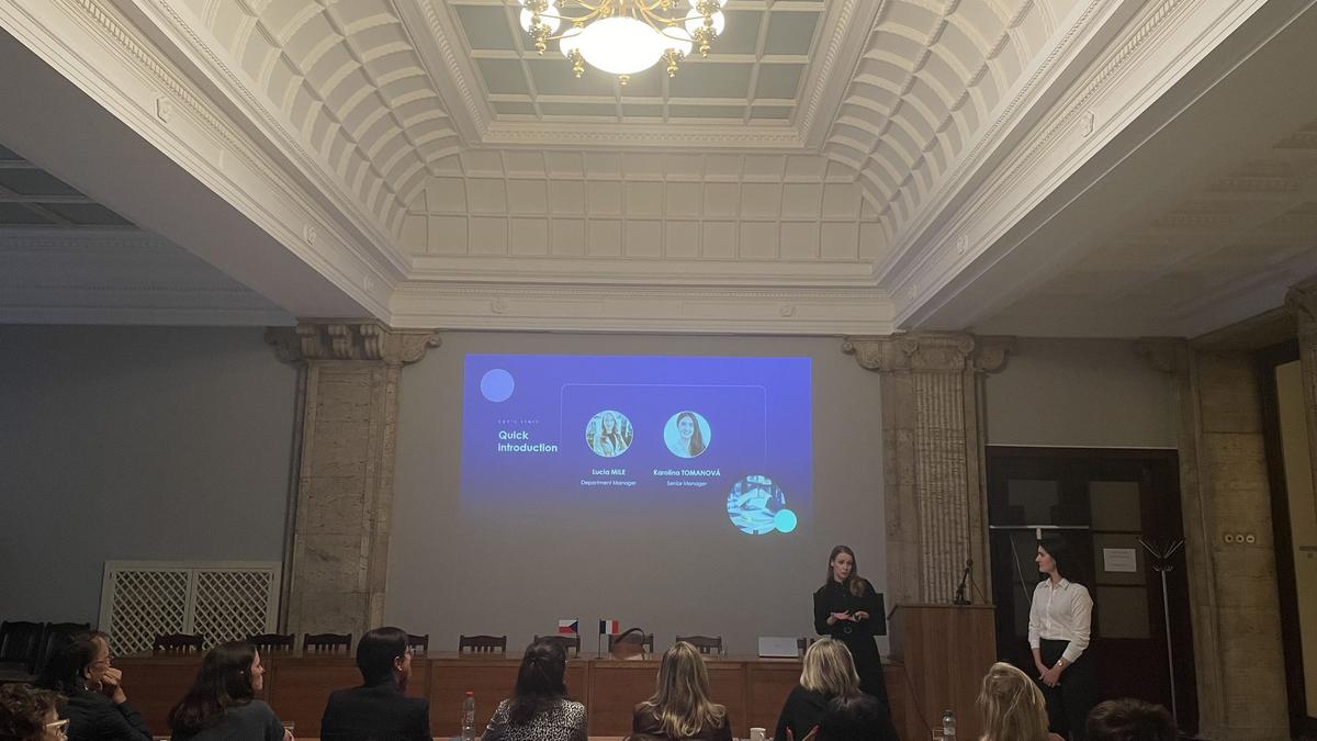 La première journée s'est terminée par une intervention de Lucia MILE, responsable de département, et de Karolína TOMANOVÁ, Senior business manager, de l'entreprise internationale de conseil technologique Amaris Consulting. Elles ont abordé l'impact de l'intelligence artificielle sur les processus de recrutement au sein des entreprises. Les discussions se sont poursuivies lors d'un dîner commun au Café Louvre, où les participants ont pu partager leurs impressions et enseignements de la journée.