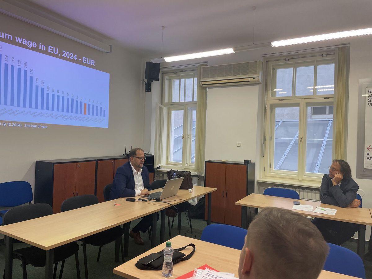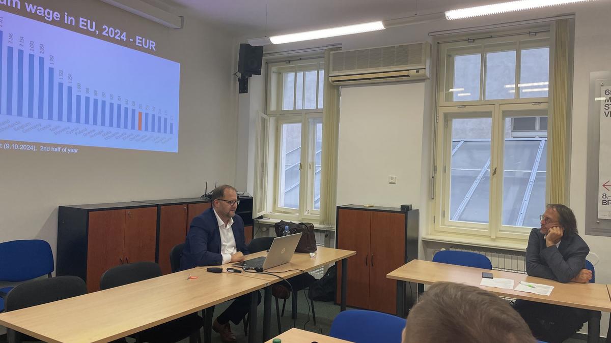 La visite s'est poursuivie à la ČMKOS (Confédération tchèque-morave des syndicats), où les étudiants ont obtenu un aperçu de l'économie tchèque du point de vue des syndicats. Tomáš PAVELKA, conseiller de la ČMKOS du département des analyses macroéconomiques et des prévisions, a présenté les défis actuels du marché du travail et offert une perspective sur l'avenir, y compris la transformation de l'industrie tchèque.