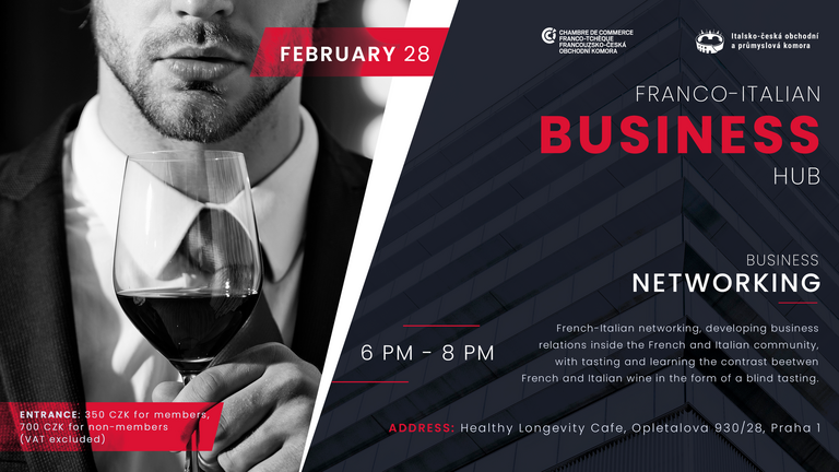 La chambre de commerce Franco-Tchèque, en partenariat avec la chambre Italo-Tchèque, a récemment organisé une soirée de networking axée sur le mode de vie sain et la longévité au Healthy Longevity Café à Prague. L'événement a offert une expérience unique de dégustation de vins français et italiens à l'aveugle, complétée par un catering sain qui a su ravir les palais des participants.