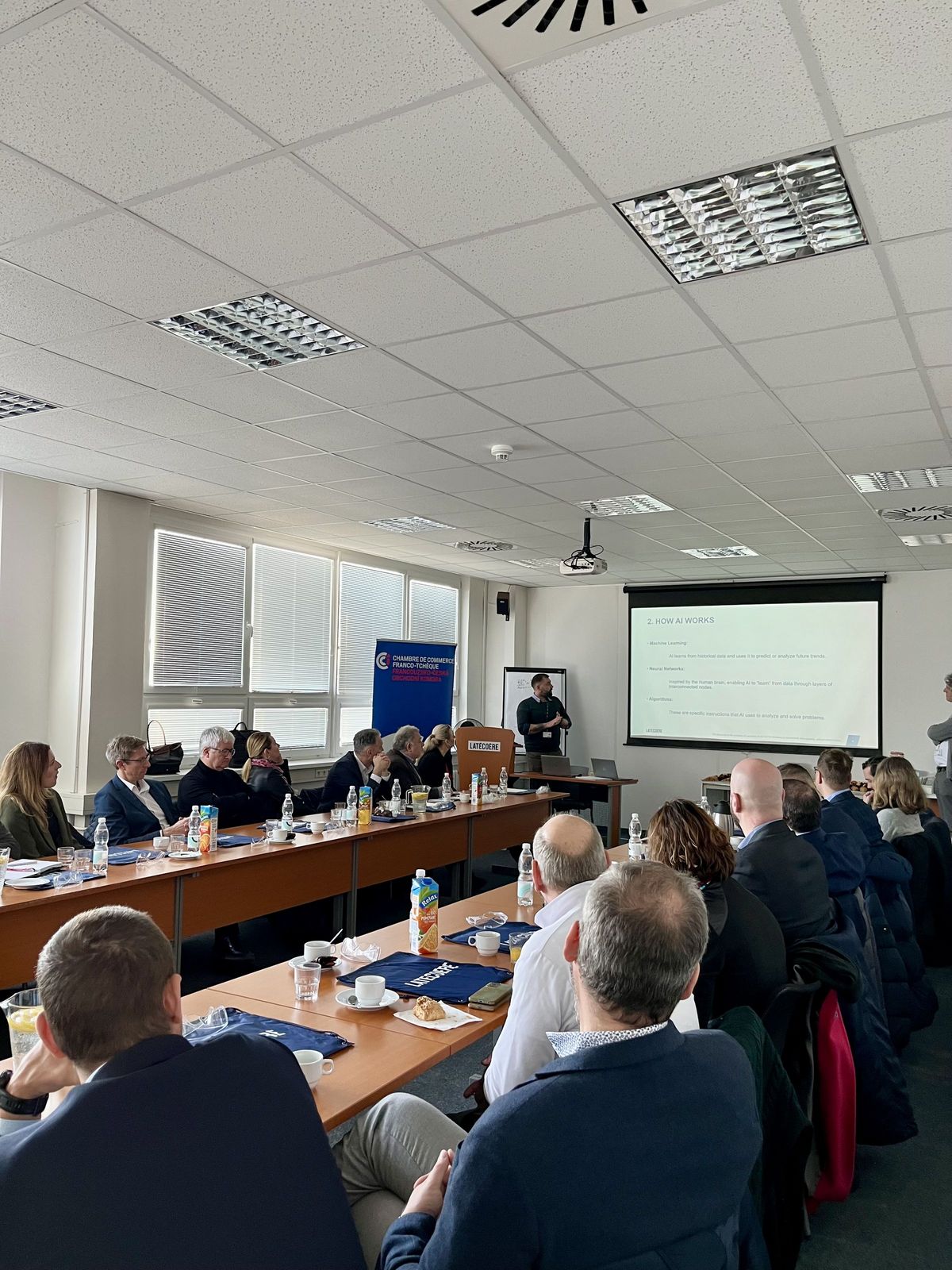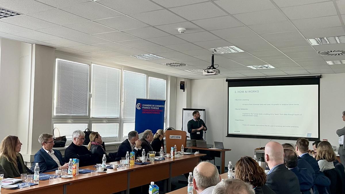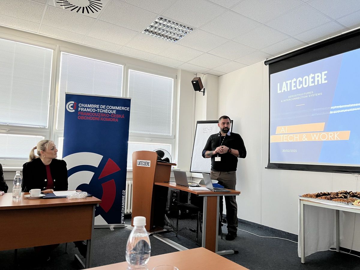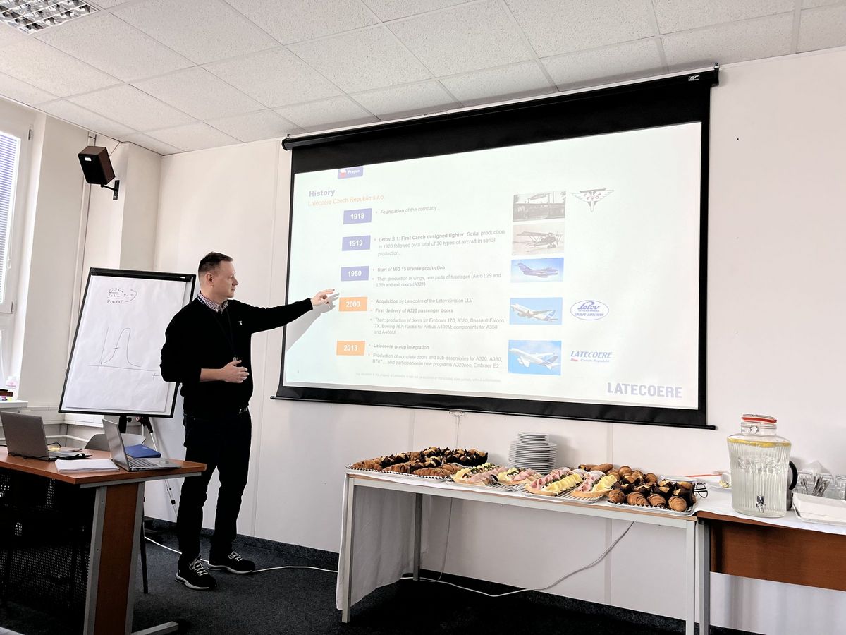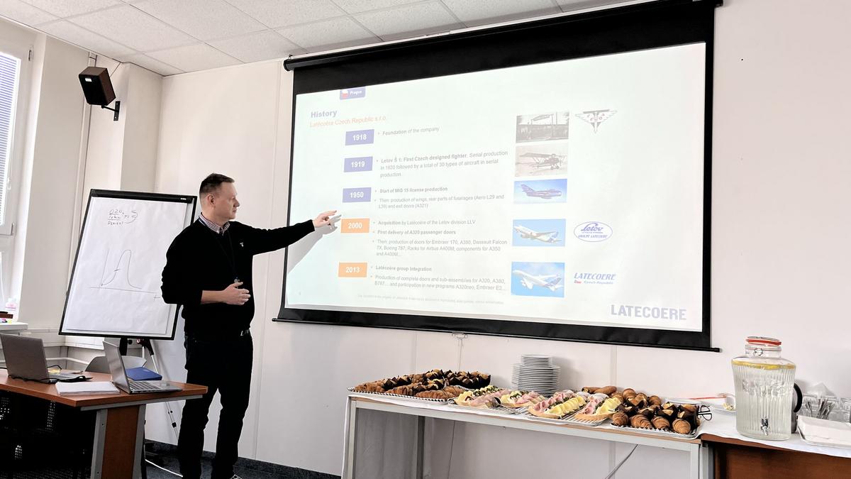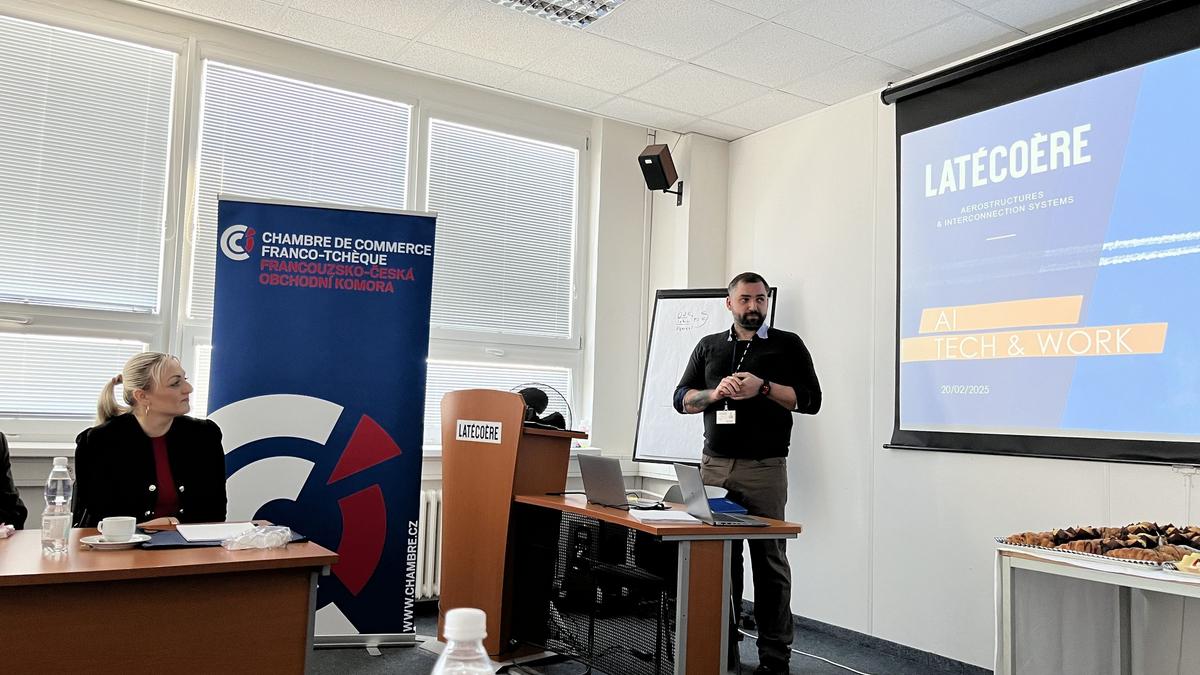 La présentation a débuté avec Martin Berg (Latecoere), qui a retracé l’histoire et les activités de l’entreprise. Libor Hovorka a ensuite pris la parole sur le thème de l’intelligence artificielle et de l’IT, illustrant l’usage d’outils IA au sein de la société, tels que les copilotes et chatbots de support client, et leur impact sur le travail des employés.